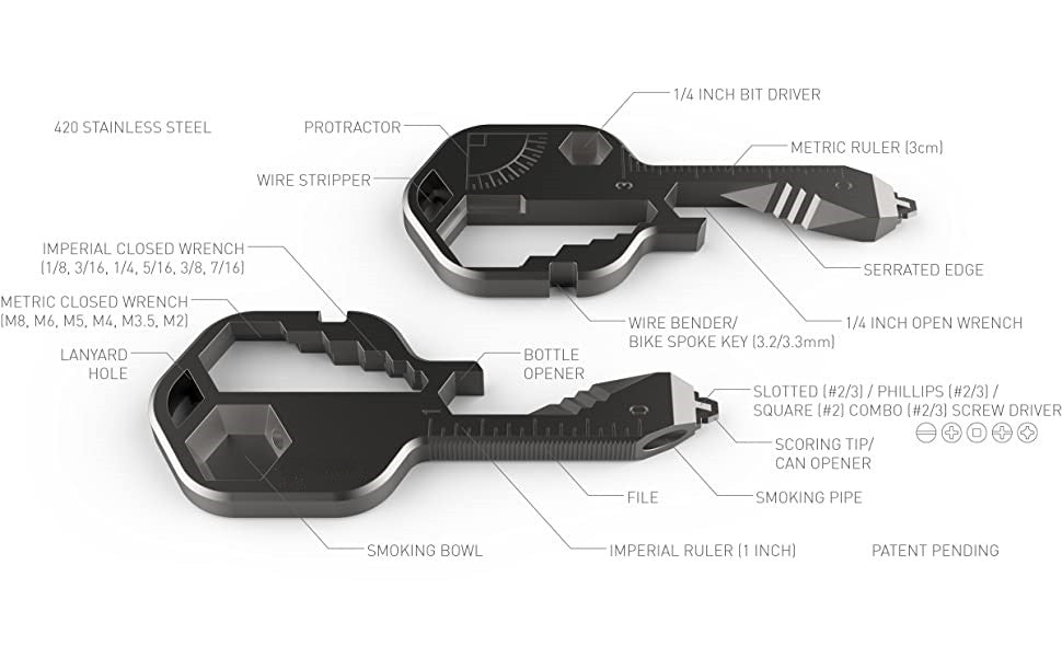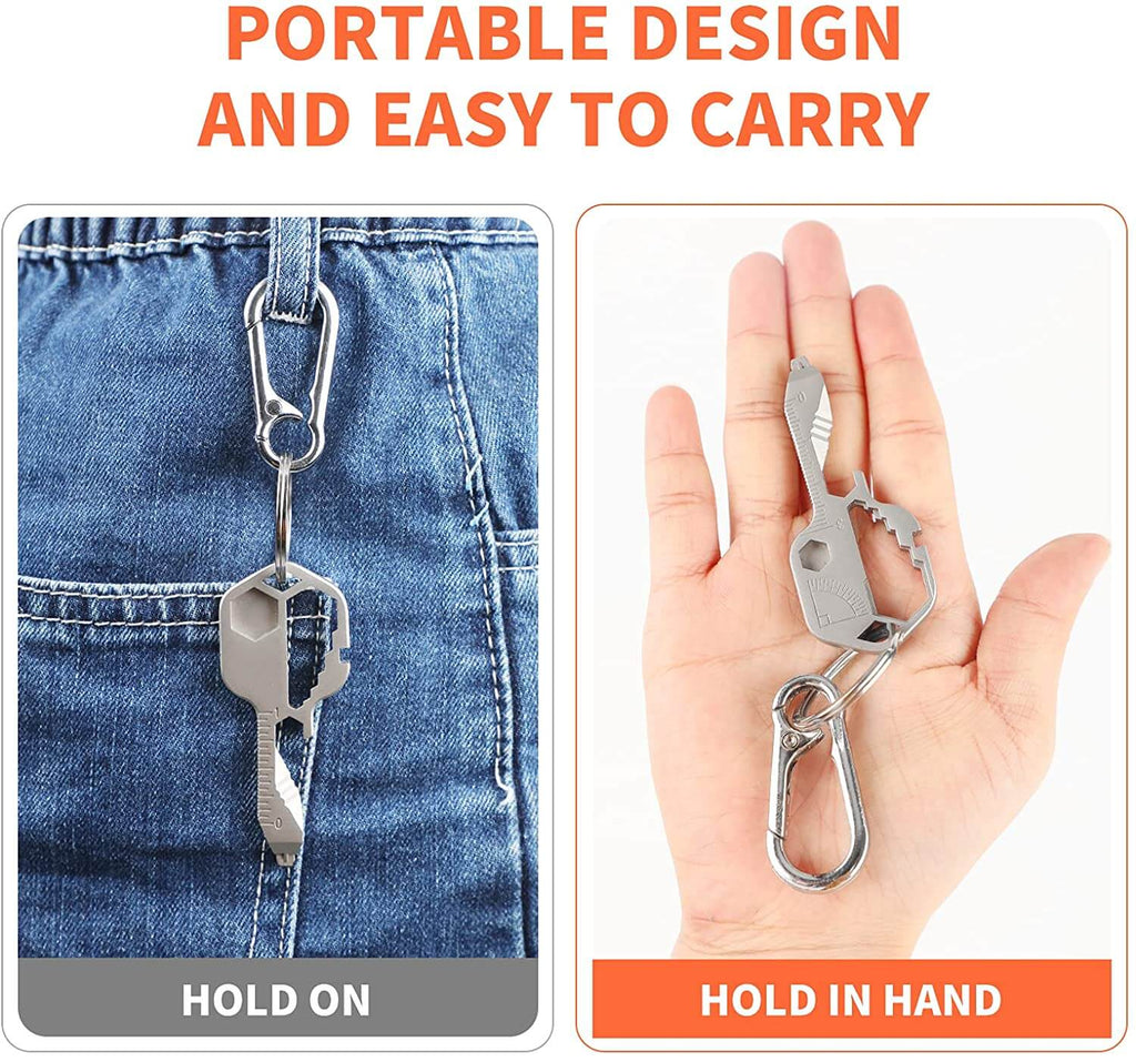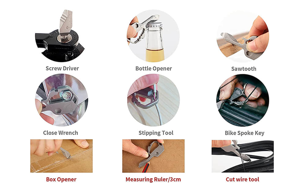 Casance Key Tools packs full of 24 different practical uses, including the functions of the screwdriver, opener, out of the box, the hex wrench, measuring ruler, angle measure, bit driver, wire stripper, serrated edge, and so on.